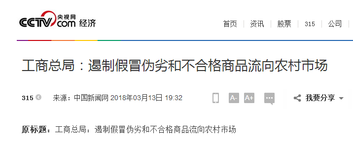 筆者發(fā)現(xiàn),國家工商總局近日在官網(wǎng)公布《關(guān)于開展2018年紅盾質(zhì)量維權(quán)行動(dòng)的通知》。《通知》提出,突出工作重點(diǎn)全面強(qiáng)化監(jiān)管執(zhí)法。各地工商和市場(chǎng)監(jiān)管部門要圍繞當(dāng)前商品和服務(wù)質(zhì)量突出問題,著力加強(qiáng)商品和服務(wù)質(zhì)量監(jiān)督檢查力度。《通知》尤其提到了過往關(guān)注力度稍弱的農(nóng)村市場(chǎng),要嚴(yán)厲打擊偽劣商品違法行為,遏制假冒偽劣和不合格商品流向農(nóng)村市場(chǎng)。