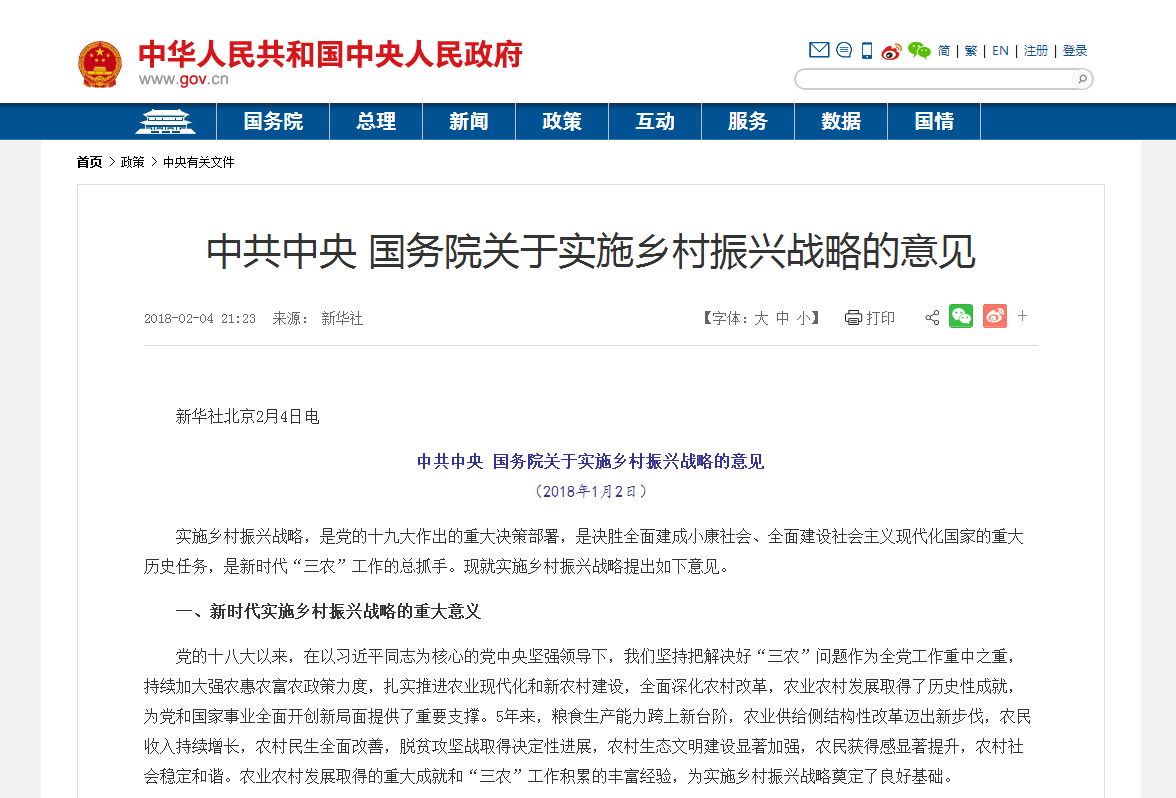 2018年1月2日,公布了2018年中央一號(hào)文件,即《中共中央國(guó)務(wù)院關(guān)于實(shí)施鄉(xiāng)村振興戰(zhàn)略的意見》 。2018年3月5日,國(guó)務(wù)院總理李克強(qiáng)在作政府工作報(bào)告時(shí)說(shuō),大力實(shí)施鄉(xiāng)村振興戰(zhàn)略。
