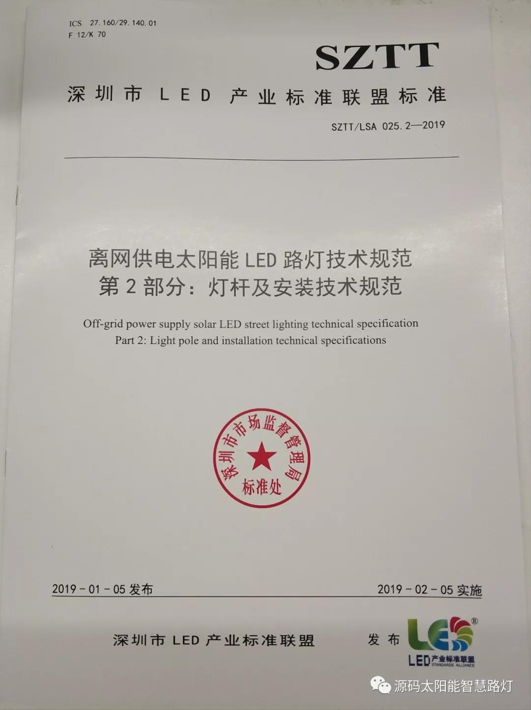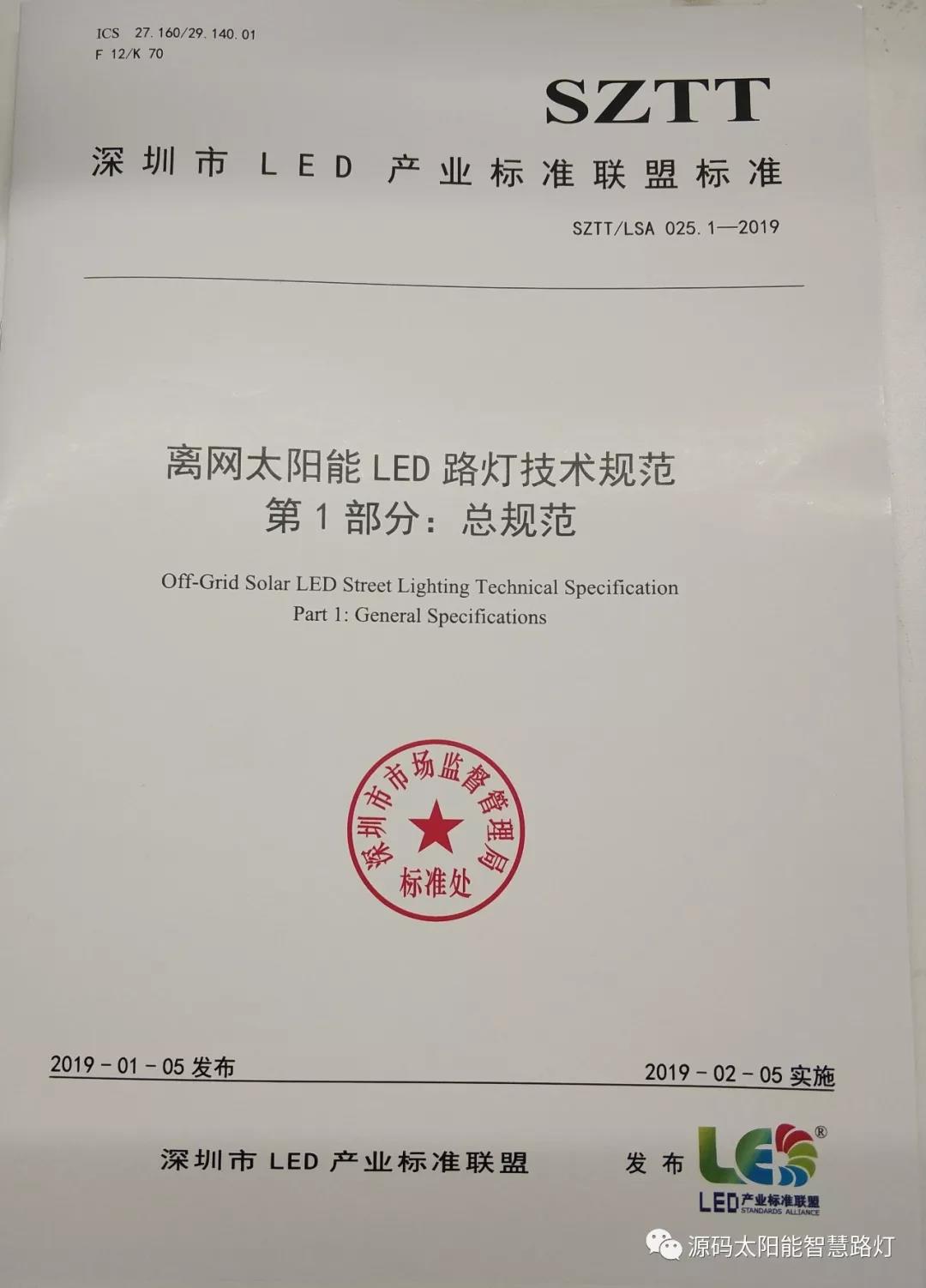 2019年1月5日,深圳市LED產(chǎn)業(yè)標(biāo)準(zhǔn)聯(lián)盟首次正式對外發(fā)布了《離網(wǎng)太陽能LED路燈技術(shù)規(guī)范》聯(lián)盟標(biāo)準(zhǔn)。《離網(wǎng)太陽能LED路燈技術(shù)規(guī)范》聯(lián)盟標(biāo)準(zhǔn)包含SZTT/LSA 025.1-2019《總規(guī)范》和SZTT/LSA 025.2-2019《燈桿及安裝技術(shù)規(guī)范》兩部分,主要由深圳源創(chuàng)智能照明有限公司、深圳市計量質(zhì)量檢測研究院、深圳清華大學(xué)研究院、深圳市標(biāo)準(zhǔn)技術(shù)研究院、國家半導(dǎo)體光源產(chǎn)品質(zhì)量監(jiān)督檢驗中心、廣東省南粵質(zhì)量技術(shù)研究院等共同起草。
