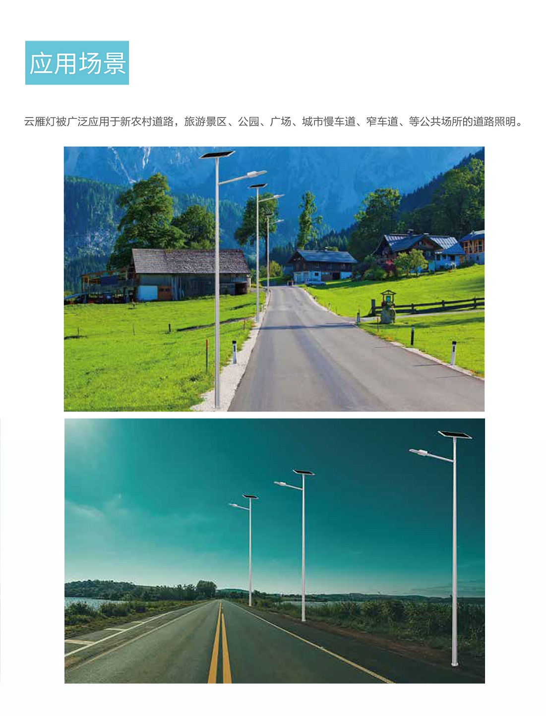 云雁燈作為分體式太陽能路燈,被廣泛應(yīng)用于新農(nóng)村道路、鄉(xiāng)鎮(zhèn)道路、城市窄車道,以及傳統(tǒng)太陽能路燈替換等場景。