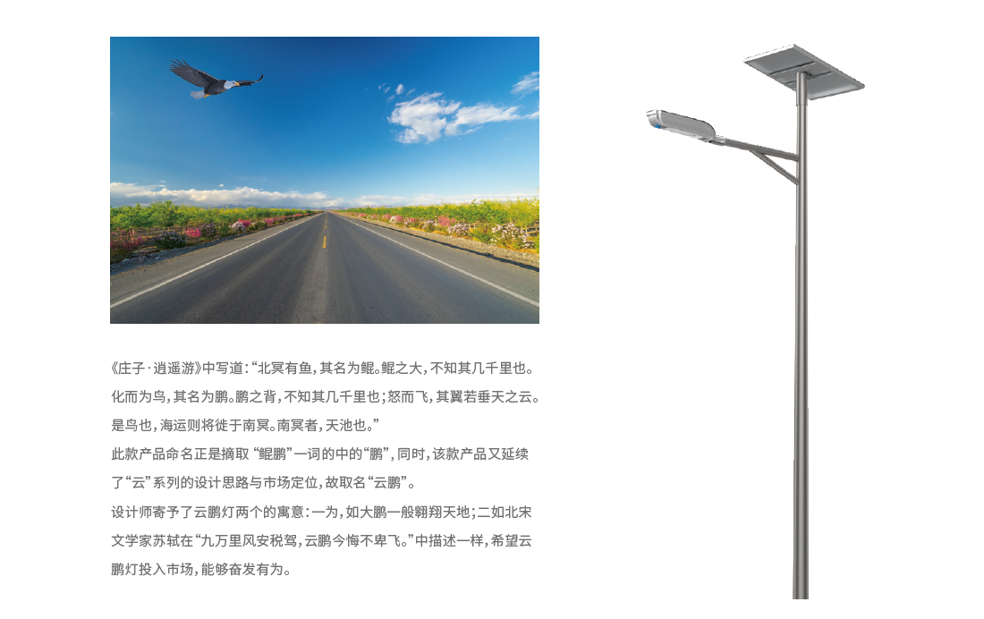 云鵬燈作為中大功率分體式太陽能路燈,被廣泛應用于新農(nóng)村道路、鄉(xiāng)鎮(zhèn)道路、城郊車道等6-10米的安裝場景。