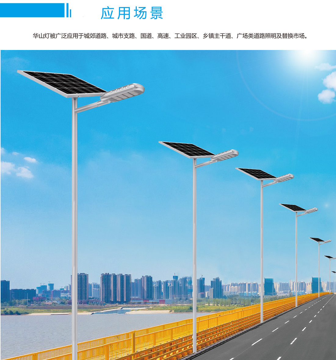 華山燈屬于高性價比的大功率分體式太陽能路燈,被廣泛應(yīng)用于城市或鄉(xiāng)鎮(zhèn)主干道或次干道,以及高速路、工業(yè)園區(qū)、廣場等場景。